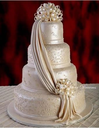 Ivory fondant cake with fondant bows, draping and trim. Buttercream details adorn each tier.
