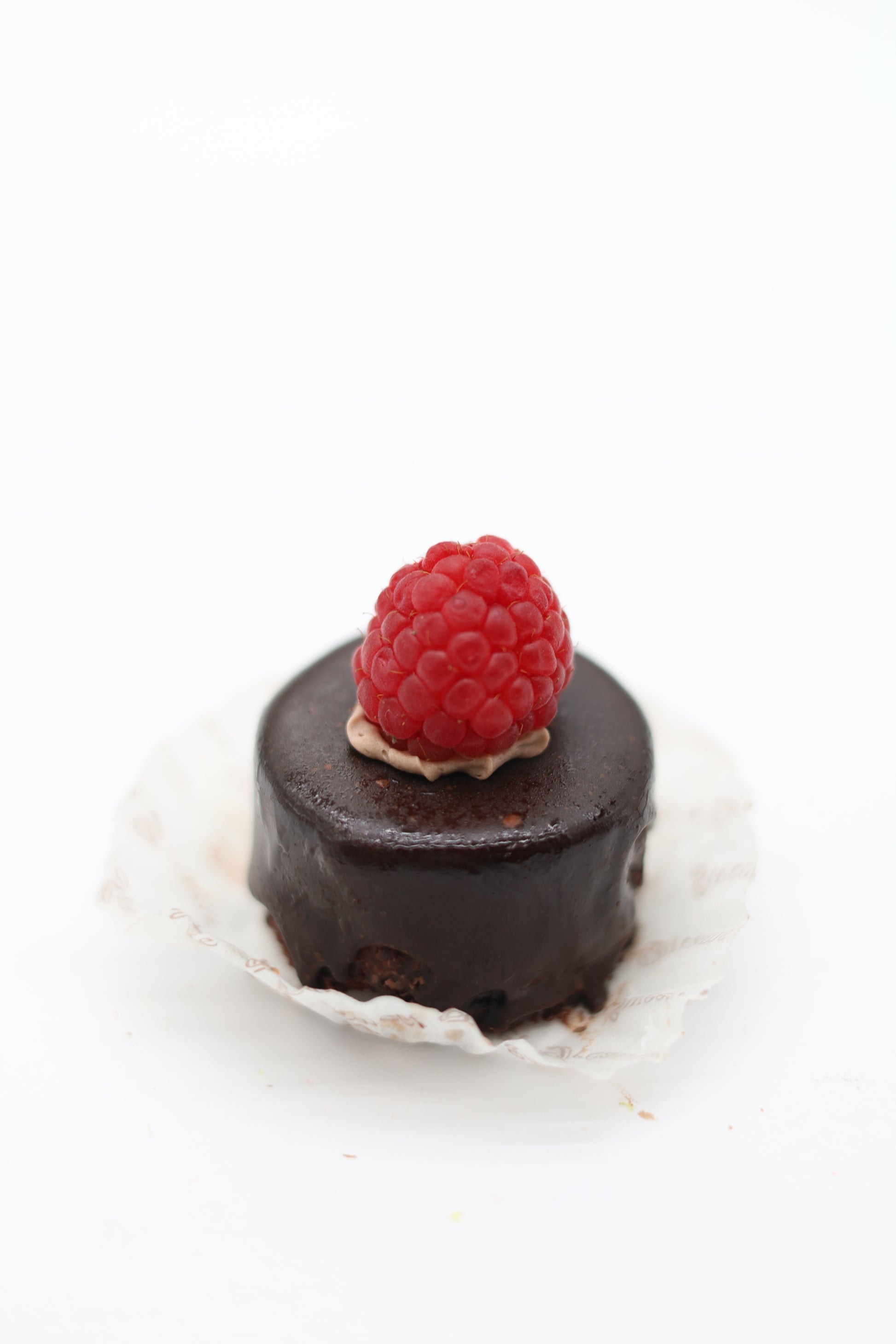 Chocolate chiffon cake layered with chocolate raspberry mousse; draped in chocolate with a fresh raspberry.