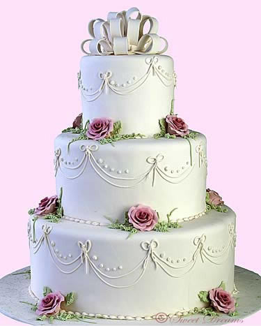 Buttercream designs on fondant with sugar flowers and a fondant bow on top.