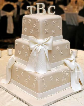 Square ivory fondant cake with white fondant bows and trim around tiers. Buttercream details. Monogram is done in white chocolate.