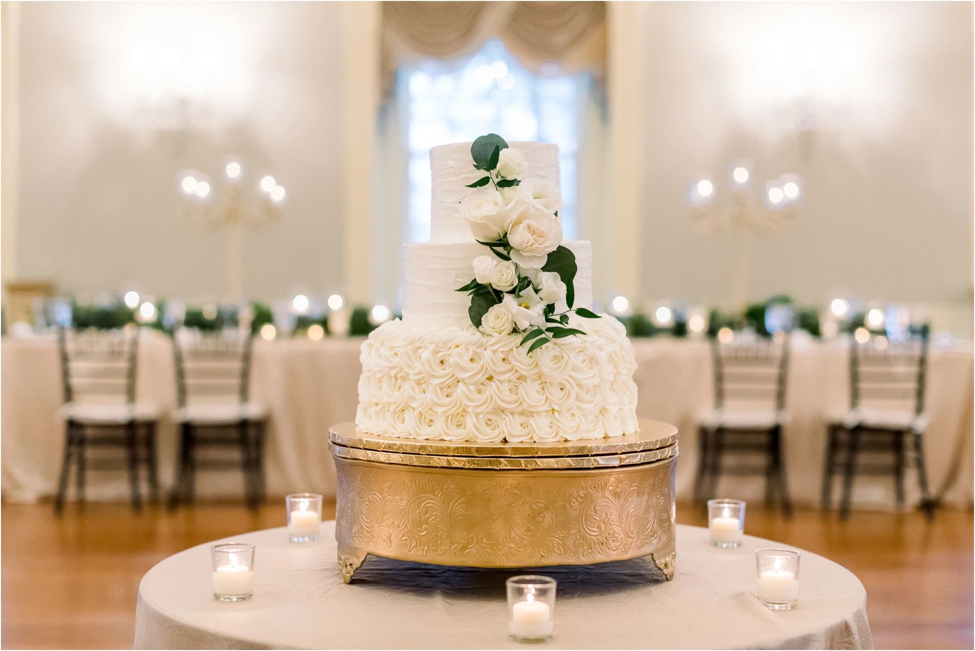 Buttercream frosting rosette top and bottom tier with silver ribbon. Topper provided by the customer. Cake stand is rental.