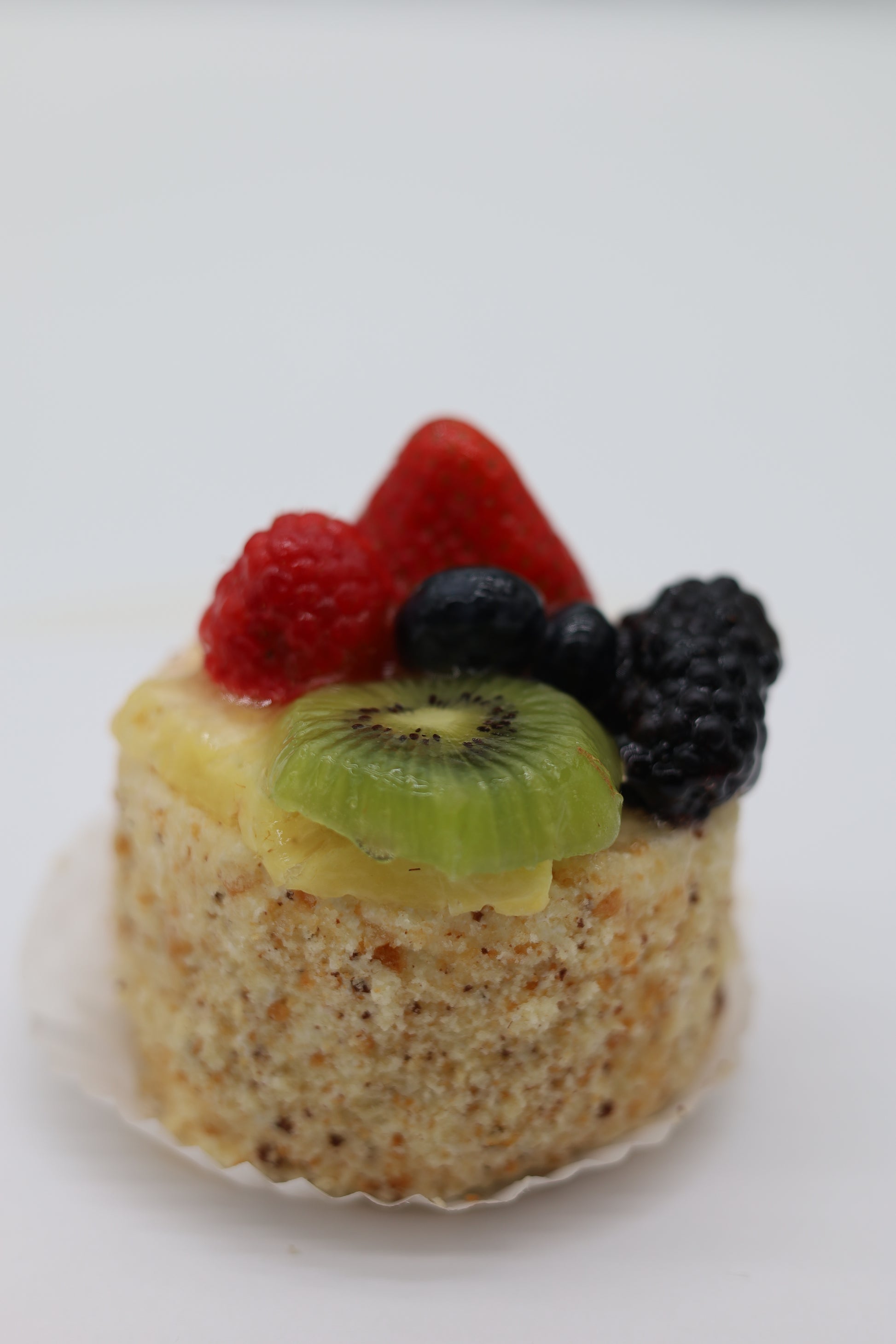 Vanilla chiffon cake, layered with Bavarian cream, blueberries, strawberries, crowned with fresh fruit and vanilla chiffon cake crumbs coating the sides.