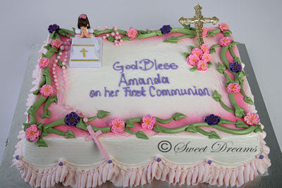 White buttercream frosting sheet cake decorated with pink details, pink sugar flowers, and praying girl ornament. The writing is done in chocolate.