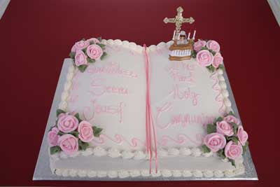 White buttercream frosting Bible sheet cake decorated praying girl, some pink roses in each corner, and pink writing.