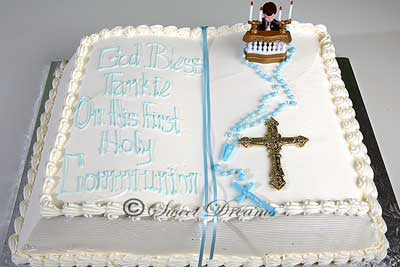 White buttercream frosting Bible sheet cake decorated with praying boy ornament, rosary, and gold cross. The writing is done in blue.