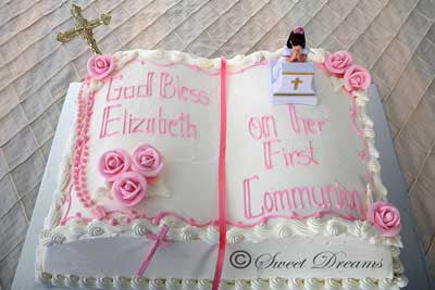 White buttercream frosting Bible sheet cake decorated with praying girl ornament and rosary on top.