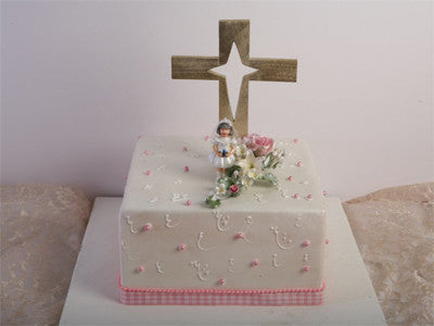 White square fondant cake with communion ornament, pink pearls and pink ribbon and a wooden cross. (Cross provided by customer)