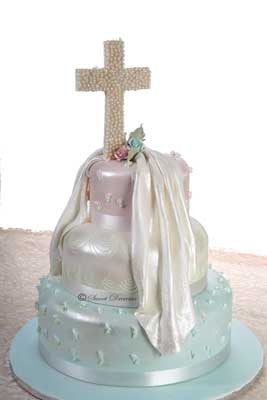 Fondant tiered cake with multi color backgrounds and some sugar flowers with a pearled cross on top.