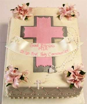Fondant sheet cake with sugar flowers on each corner with a 2 tone cross on top. Sheet Sizes ONLY.