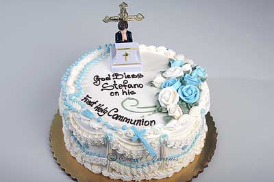 White buttercream frosting round cake decorated with white and blue sugar flowers, communion ornament, rosary, and gold cross. It is finalized with blue accents and chocolate writing.