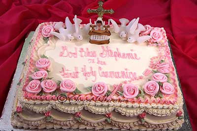 White buttercream frosting cake decorated with pink details, pink sugar flowers, communion ornament, gold cross, rosary, and double dove. The writing is done in pink.