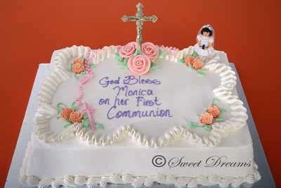 White buttercream frosting sheet cake decorated with sugar flowers and praying girl ornament. Writing is in lavender.