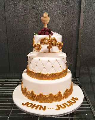 White fondant cake with gold decor, fondant grapes, and chocolate chalice.