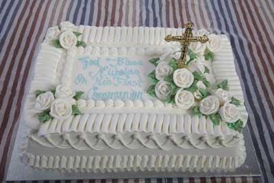 White buttercream frosting sheet cake with white sugar flowers, a cross, and baby blue writing.