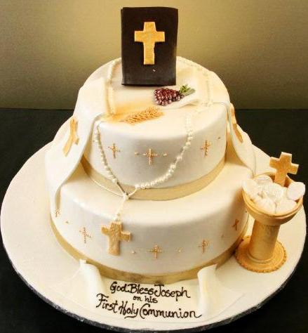 Fondant tiered cake with a hand crafted fondant bible and chalice.
