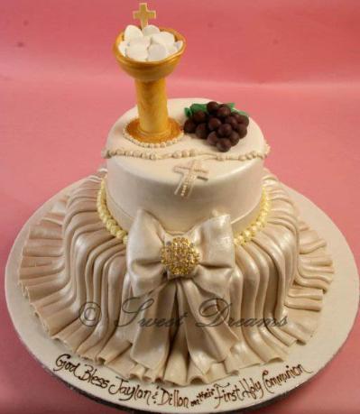 Tiered fondant cake with fondant bow and brooch. Fondant chalice. Host and Grapes. Pleated fondant bottom tier and rosary made from buttercream.