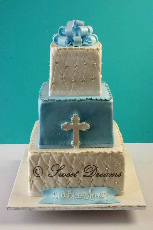 3-tier fondant square cake with diamond pattern on the bottom and top tier and blue fondant middle tier with fondant cross and blue bow on the top.