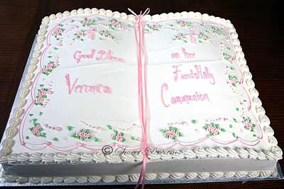 White buttercream frosting Bible sheet cake decorated with pink accents and pink writing.
