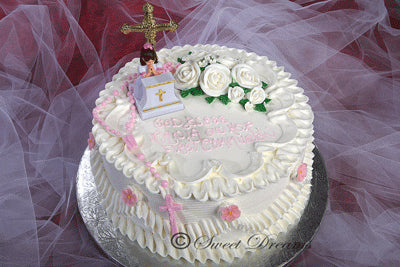 White buttercream frosting cake decorated with white sugar flowers, some pink details and praying girl ornament. The writing is done in pink.