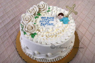 White, round buttercream frosting cake with some sugar flowers and a baby sleeping with a cross behind the baby.