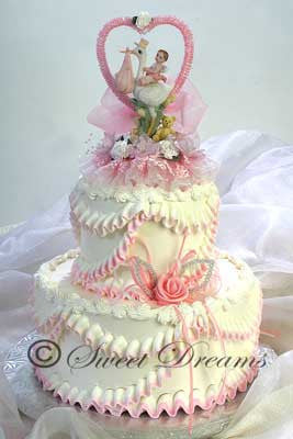 White, round, tiered buttercream frosting cake decorated with pink writing and all pink decoration, with a plastic baby carriage on the top tier. Customer has to provide topper; topper is not included in price.