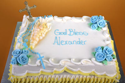 White buttercream frosting sheet cake with yellow trimming, blue sugar flowers, gold cross and rosary.