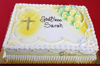White buttercream frosting sheet cake with yellow sugar flowers and yellow details.