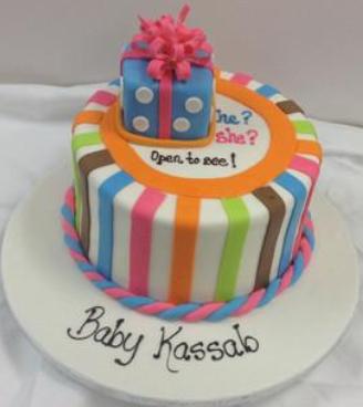 White fondant cake with fondant colored stripes and a fondant covered box on top.