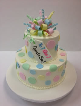 Buttercream covered tiered cake with pastel fondant dots, bow and sign.