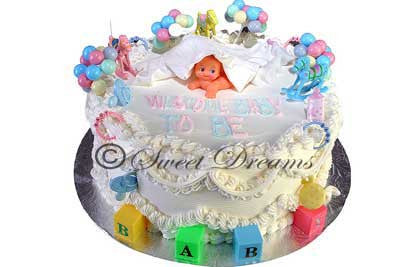 White, round buttercream frosting cake with baby peeking from underneath a blanket and baby decorations.