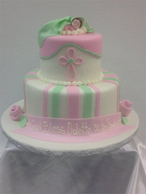 Multi-colored fondant tiered cake with a baby sleeping on top with a fondant blanket.
