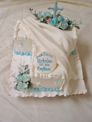 White buttercream frosting cross-shaped cake with a fondant blanket and baby on top.