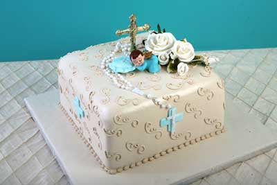 Ivory square fondant cake with sleeping baby, plastic rosary, plastic gold cross and sugar flowers. Finished with baby blue fondant crosses around.
