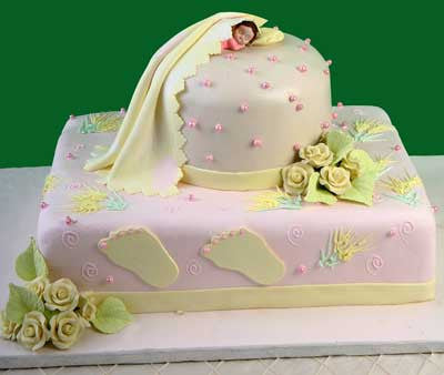 Pink fondant sheet cake with yellow fondant ribbon around on the top. Sugar flowers and baby sleeping with fondant blanket.