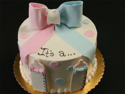 Buttercream frosting gender reveal cake with pink and blue fondant polka dots.