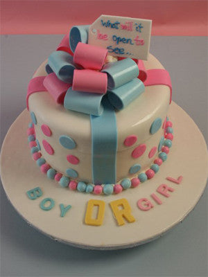 Round fondant cake with pink and blue polka dots for a gender reveal.