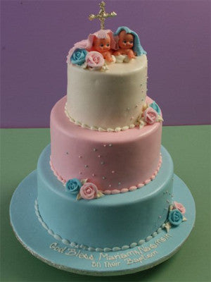 Fondant tiered cake with multi-colored tiers with babies on top.