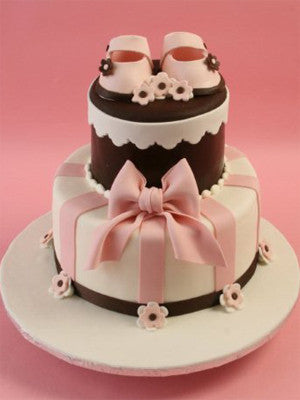 Fondant tiered cake with pink and brown colored tiers and fondant shoes on the top.