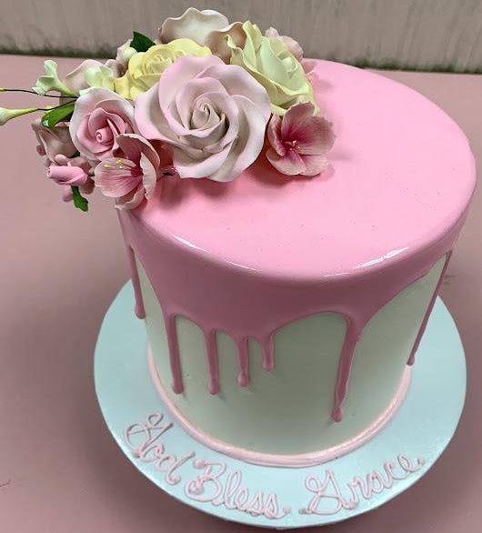 Elevated buttercream frosting cake with pink drip and sugar flowers.
