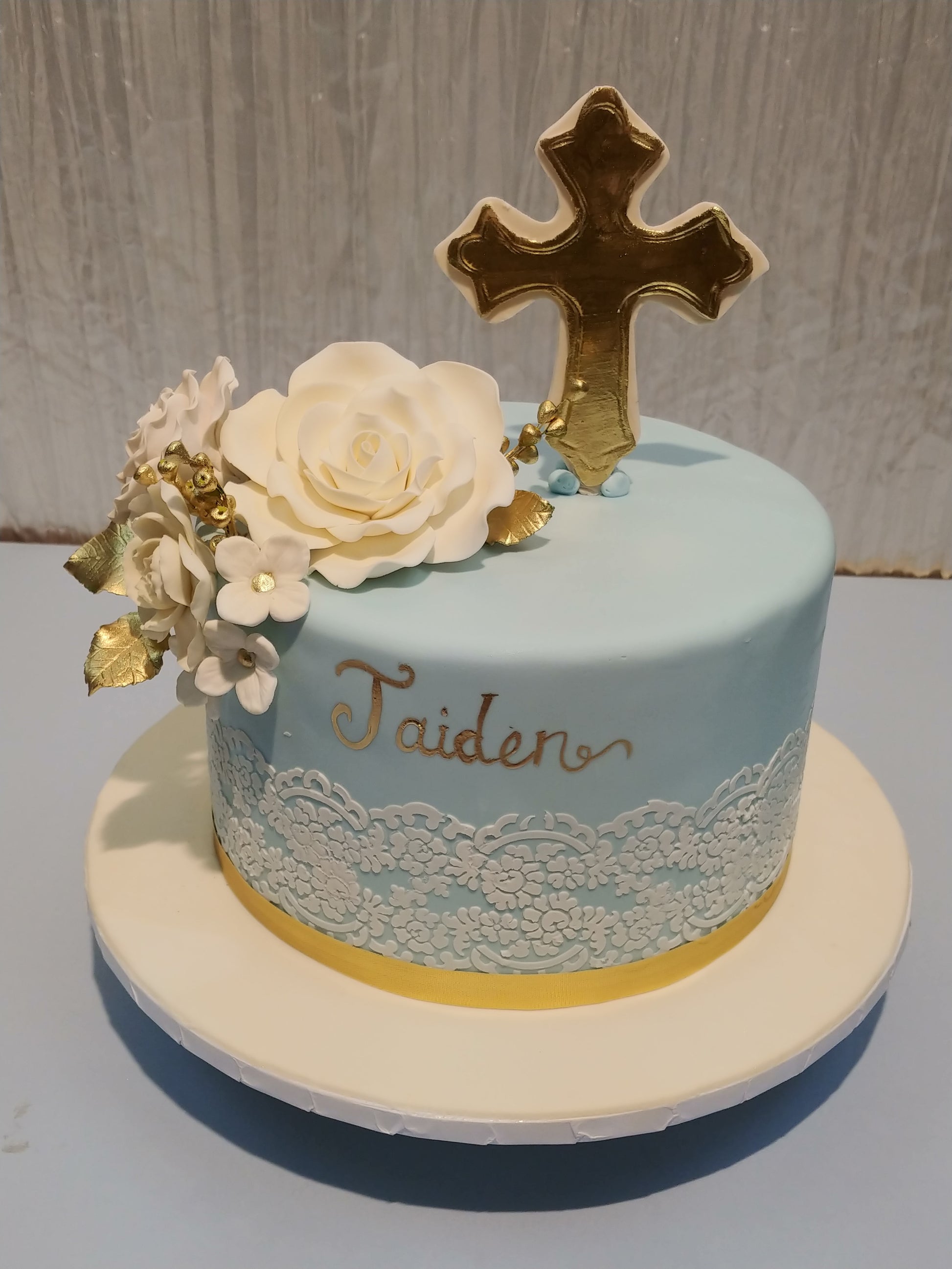 Light blue fondant round cake with fondant board, stencil around the side with gold ribbon, sugar flowers draping and gold painted cross. Writing is done in gold.