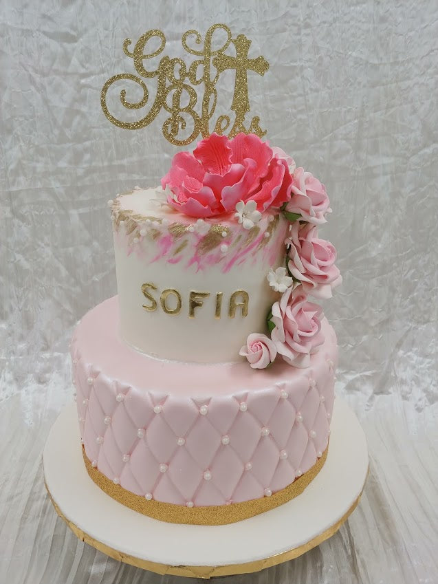 Fondant tiered cake with gold cross (topper provided by the customer) on the top and decorative sugar flowers around the top tier and cascading on the side, pink and gold painted on the side of the top tier, the name is painted in gold. The bottom tier is quilted diamond pattern pink fondant, pearls and gold ribbon.