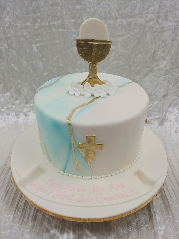 Marble light blue fondant round cake with gold fondant chalice, and a gold painted cross on the side.