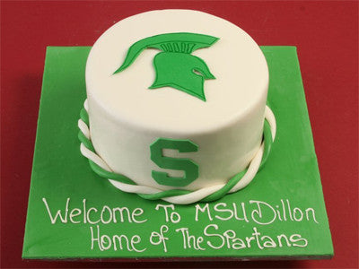 Green and white fondant cake with "Michigan State" theme.