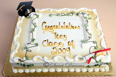 Buttercream sheet cake with vine details. plastic cap and paper diploma.