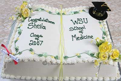 Open book sheet cake with white buttercream, decorated with yellow sugar flowers and graduation hat and diploma. The writing can be done in any color.
