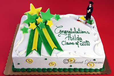 Buttercream sheet cake with green and yellow fondant stars and ribbons. Buttercream dots and swirls around side of cake. Plastic graduation girl and paper diploma.