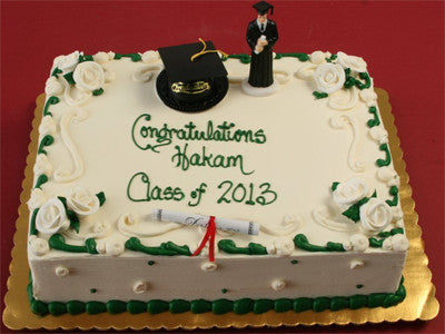 Buttercream sheet cake with sugar flowers, plastic graduation figure and cap.