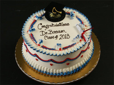 Round red, white and blue buttercream cake with paper diploma and plastic cap.