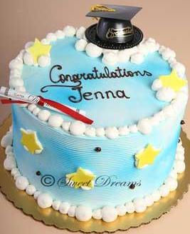 White round buttercream cake sprayed in baby blue color. plastic graduation hat and a paper diploma, with yellow fondant stars.